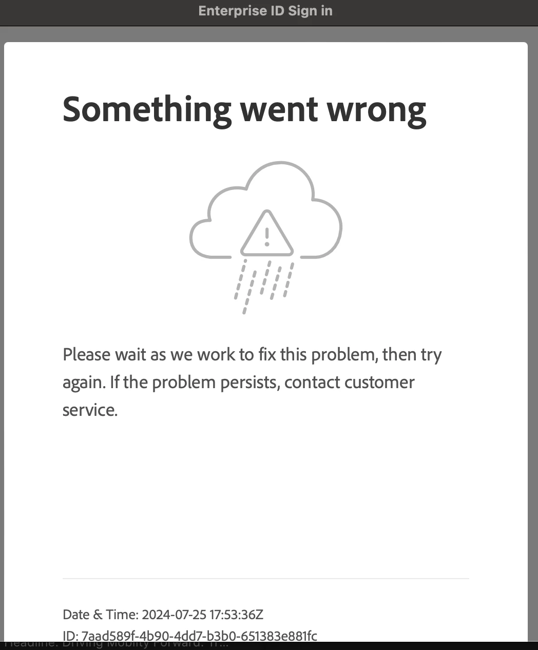 I’m having a problem trying to install applications on my Mac, I have an enterprise license. I go to the Adobe website and I can download any application, but the issue is that when I follow the instructions I try to log in in my corporate account, but I can’t. A pop-up window appears saying “Something went wrong, Please wait as we work to fix this problem, then try again. If the problem persists, contact customer service.”