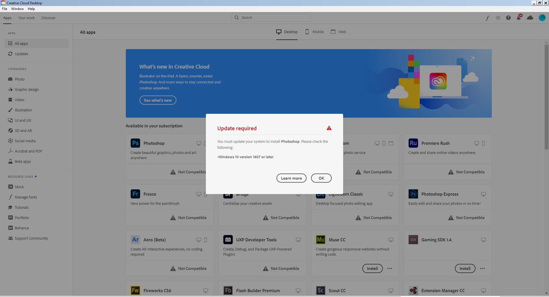 I used to be an ardent user of Adobe programs, but I stopped using them back in 2018. Today I have tried to return to Adobe Programs, only to discover that Creative Cloud now blocks me from installing the old Photoshop versions I used to own becuase I am on Windows 7.