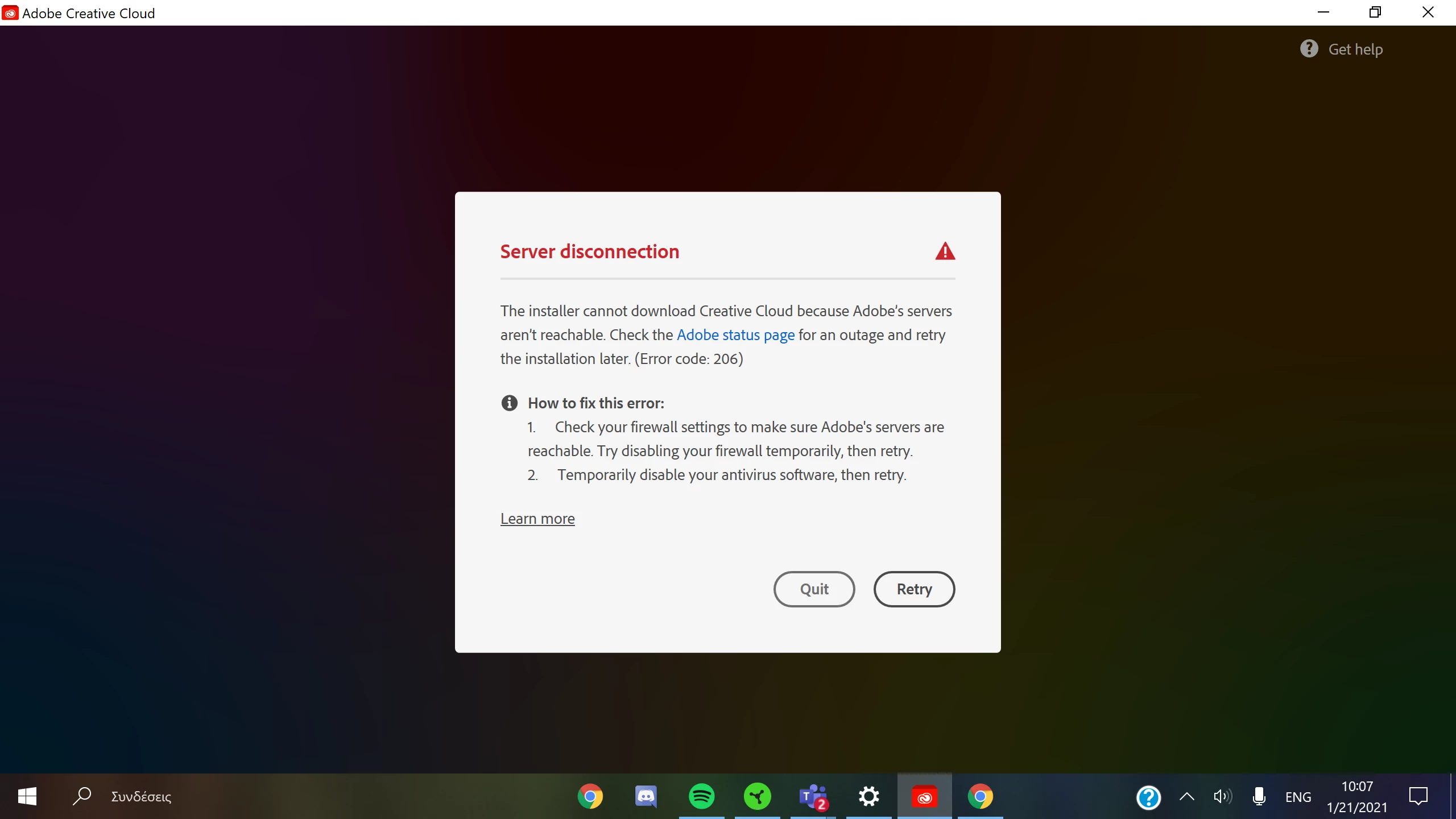 I want to download creative cloud I downloaded the instaler but then it says that server disconnection. Please help!