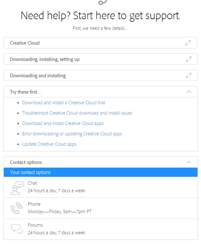 Select the exact options shown below in the screen shot to get support options: