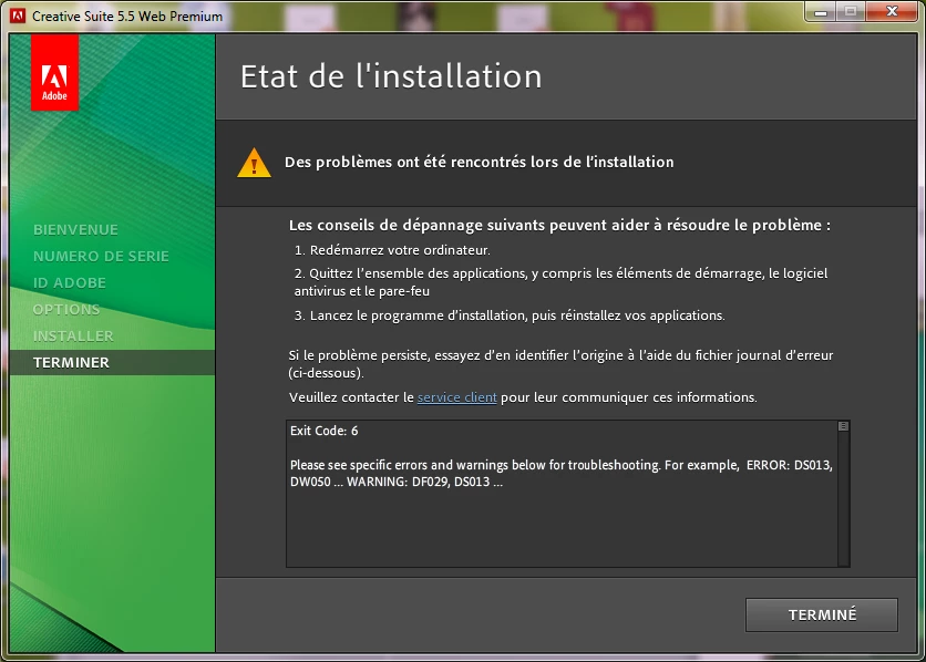 When i install again my Adobe Web premium cs5.5 on my computer, i have this error :