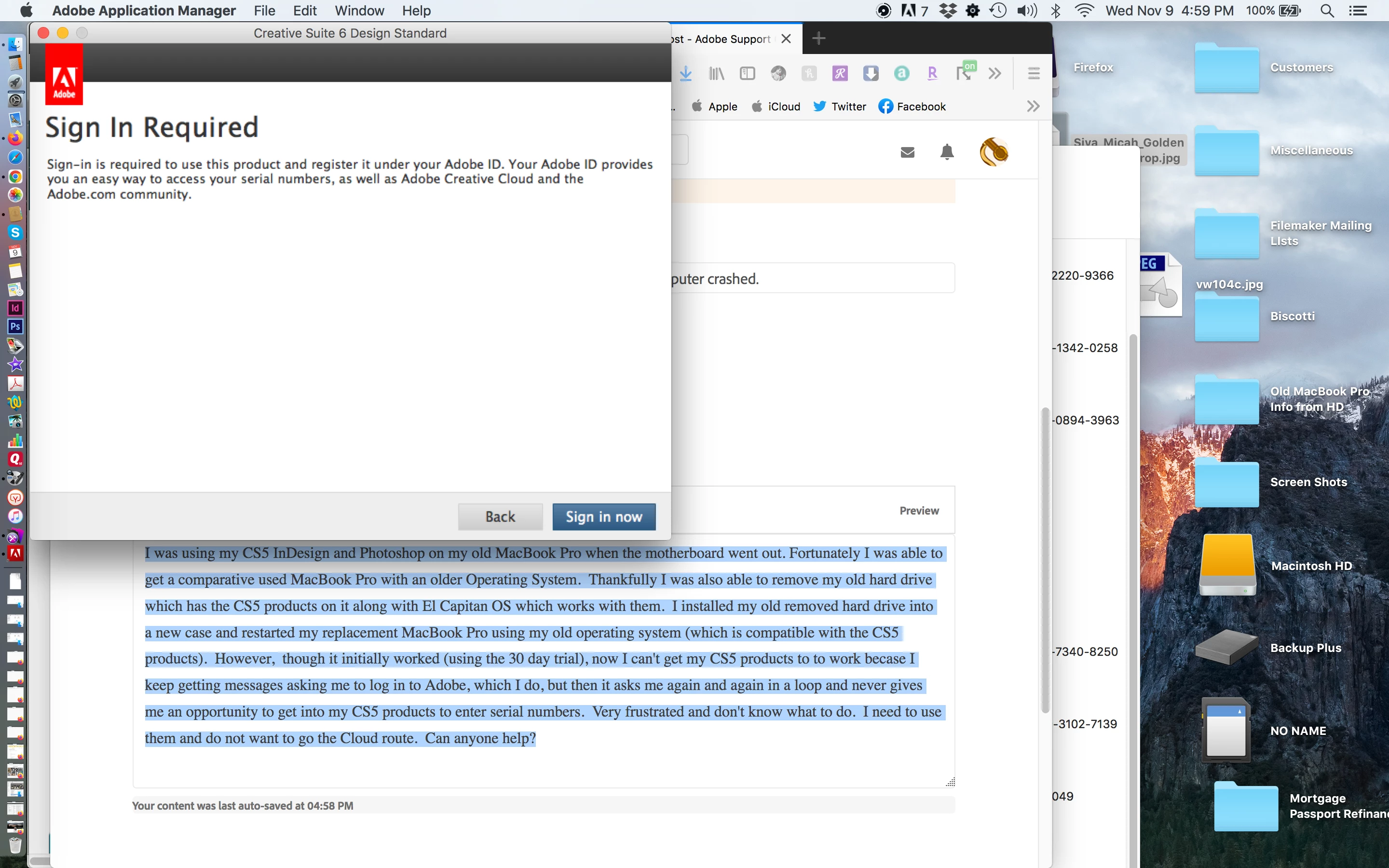 I was using my CS5 InDesign and Photoshop on my old MacBook Pro when the motherboard went out. Fortunately I was able to get a comparative used MacBook Pro with an older Operating System. Thankfully I was also able to remove my old hard drive which has the CS5 products on it along with El Capitan OS which works with them. I installed my old removed hard drive into a new case and restarted my replacement MacBook Pro using my old operating system (which is compatible with the CS5 products). However, though it initially worked (using the 30 day trial), now I can't get my CS5 products to to work becase I keep getting messages asking me to log in to Adobe, which I do, but then it asks me again and again in a loop and never gives me an opportunity to get into my CS5 products to enter serial numbers. Very frustrated and don't know what to do. I need to use them and do not want to go the Cloud route. Can anyone help?