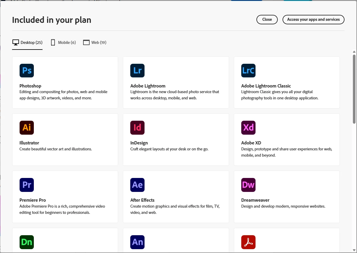 I'm paying an Anual, Monthly plan of $31 a month to have access to all of Adobe Creative Cloud apps, yet I only have access to the basic apps:
