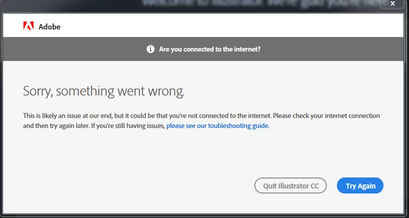 I installed Illustrator CC 2019 but it's not opening after that. It's showing error screen Are you connected to the internet.