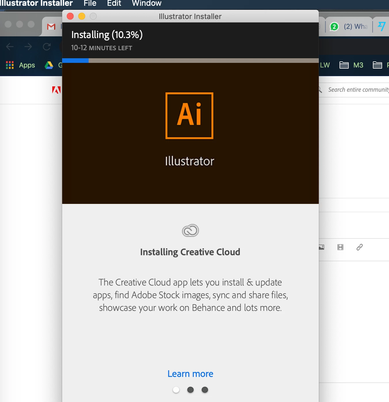 I previously uninstalled the creative cloud, and redownloaded the illustrator installer after purchasing it earlier today. Progress bar stopped at 10.3% again and has refused to budge for hours.