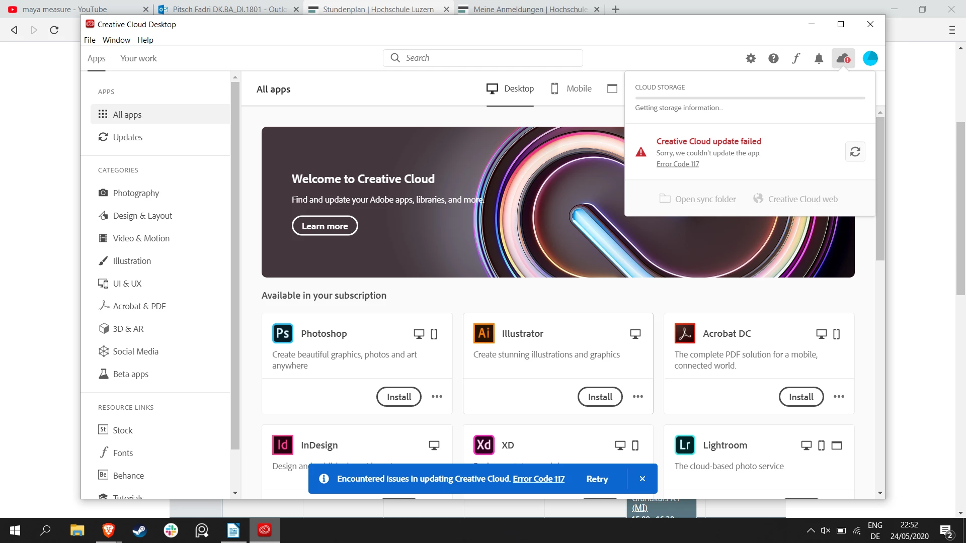 I have tried again, and again to install Adobe Creative Cloud, but it's still not working at all! I have also read all the instructions due the error code 117 (https://helpx.adobe.com/download-install/kb/error-code-117.html) and tried all steps, but it is still not working! I have also tried to uninstall, other internet conections and and... (below a screenshot, of the error)