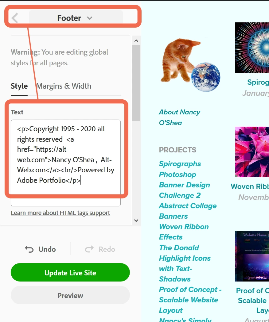 In Adobe Portfolio how do I add a Privacy Policy with a link?