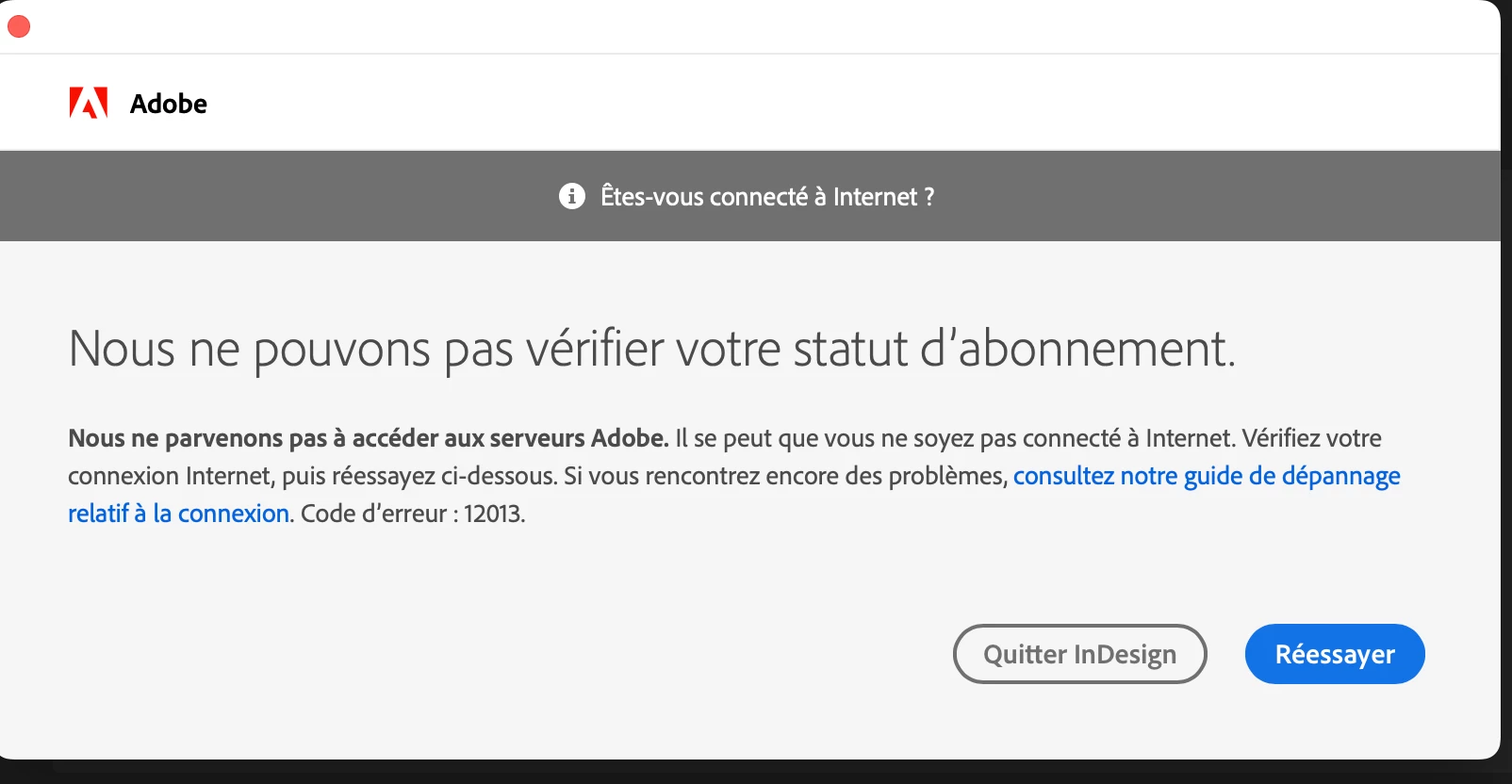 J'ai installé / désinstallé Creative CLoud 100 fois, j'ai suivi les tutos, j'ai un abonnement payant Crative CLoud formule complète mais pourtant j'ai toujours ce message... je ne sais pas quoi faire!