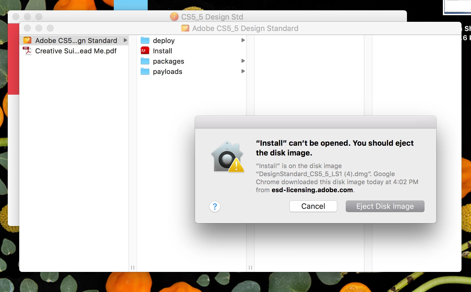 I am trying to install a previously licensed version of CS5.5 onto my new Macbook Pro. I logged into Adobe Worldwide Licensing and tried to download the installer, both via the "Download" and "Download Manager" buttons. I get as far as completing the download, opening CS5_5 Design Std folder, double-clicking "Install", and then receive the following error in a popup:
