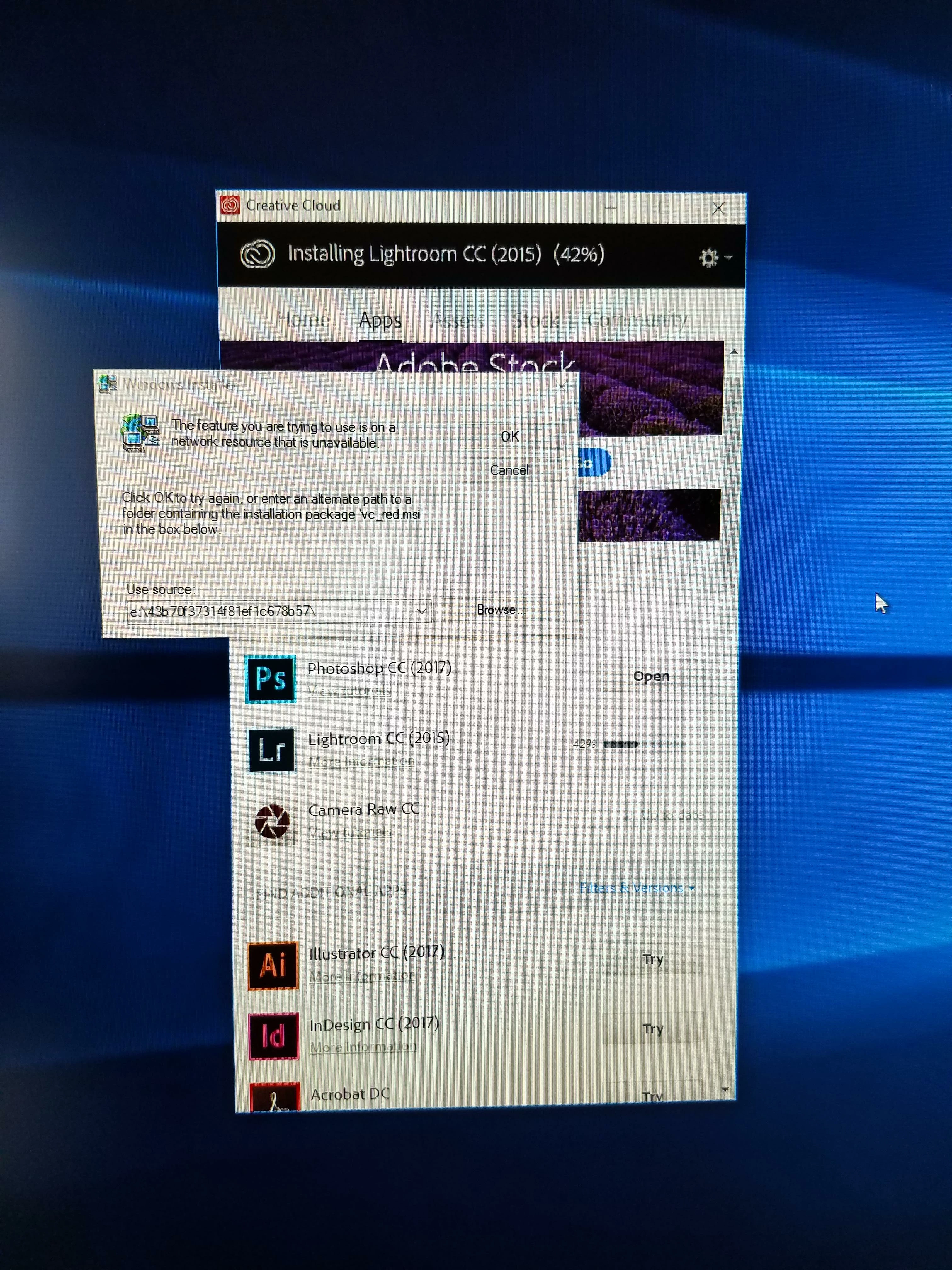 Click OK to try again or enter an alternate path to a folder containing the installation package "vc_red.msi" in the box below"