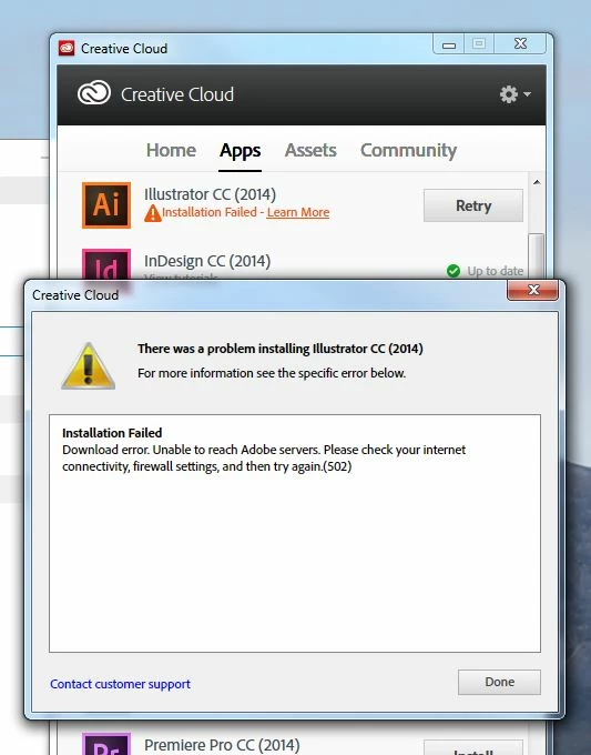 Download error. Unable to reach Adobe servers.