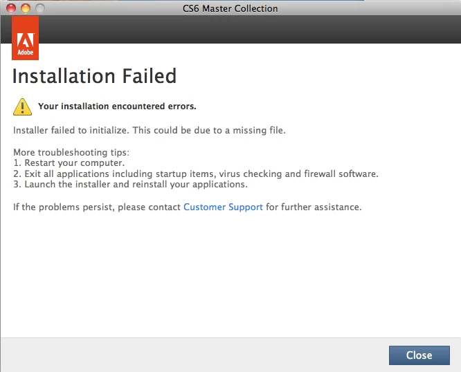 I'm trying to install CS6 Master Collection on my Macbook Pro running Snow Leopard (10.6.8) and I keep getting the error message, "Installation Failed. your installation encountered errors. Installer failed to initialize. This could be due to a missing file."
