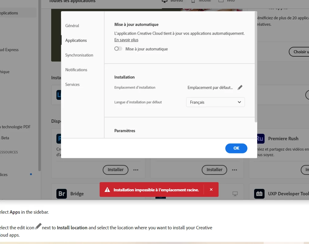 Je souhaite changer l'emplacement d'installation sauf que j'ai un message d'erreur.