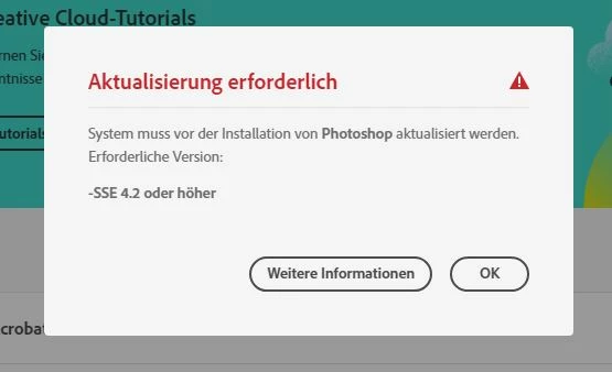 Vor Installation von Photoshop wird eine Aktualisierung des Betriebssystem (auf u.a. "sse 4.2 oder höher") verlangt. Ich habe aber keine Möglichkeit dazu.