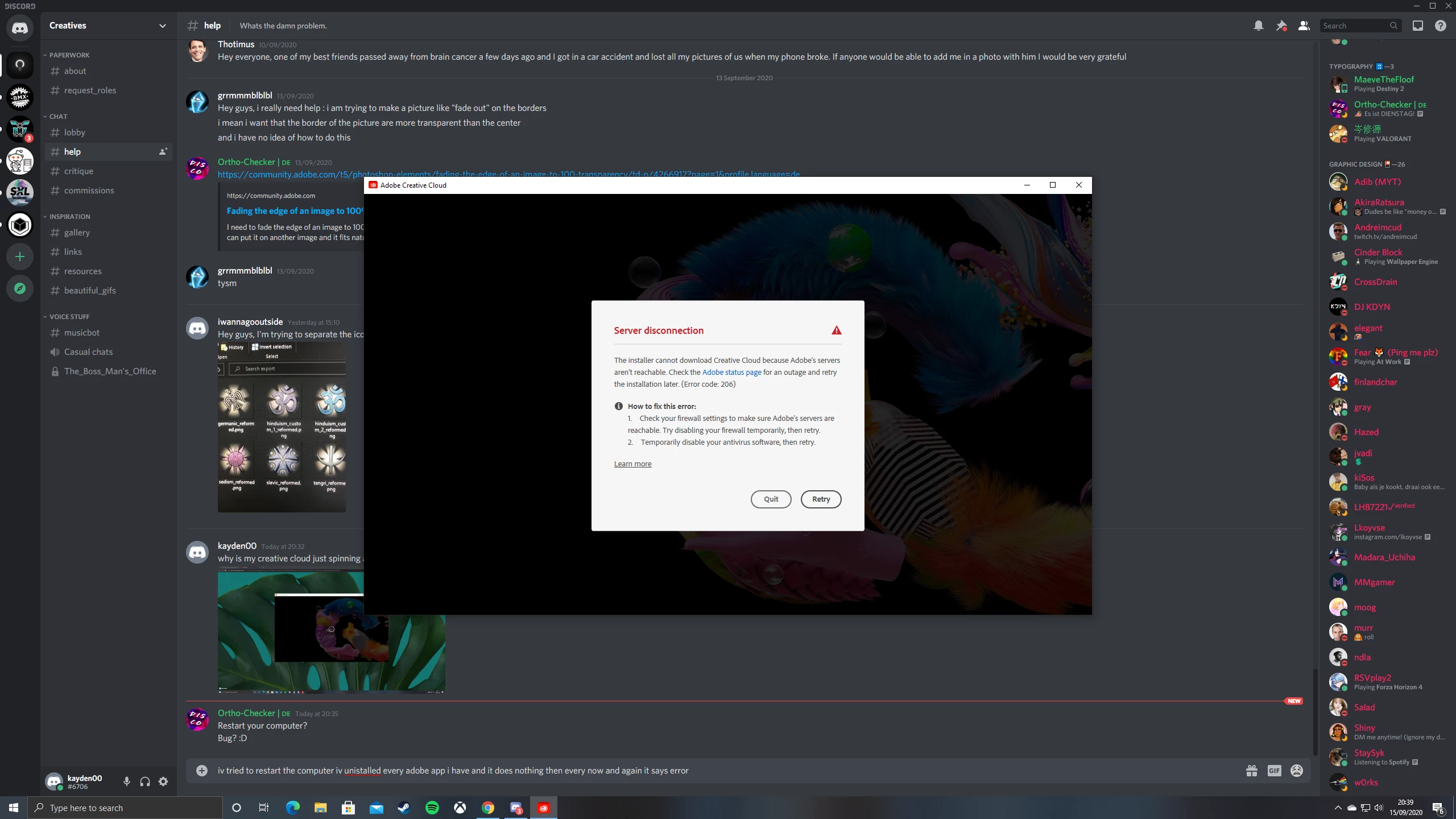 when i try to download creative cloud it just sits on a spinning circle for atleast 10 minutes opening tabs on google telling me im signed then when the circle goes away i get error 206 telling to disable my firewall and retry but when i do that nothing happens