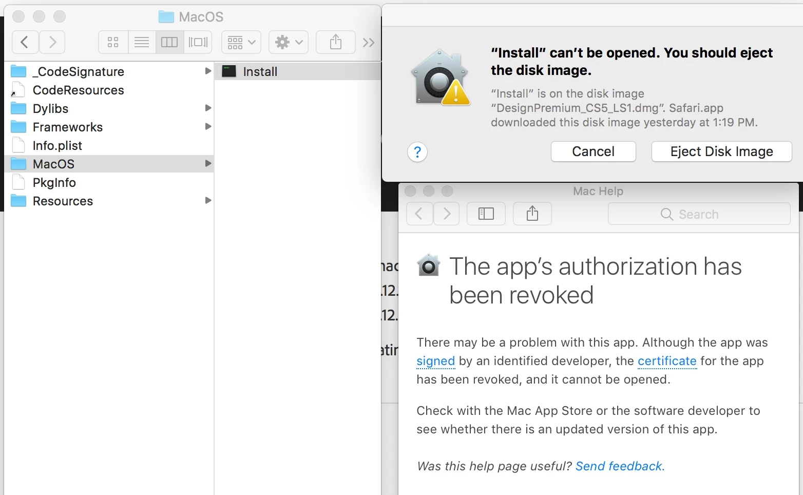 The app’s authorization has been revoked There may be a problem with this app. Although the app was signed by an identified developer, the certificate for the app has been revoked, and it cannot be opened. Check with the Mac App Store or the software developer to see whether there is an updated version of this app. Was this help page useful? Send feedback.