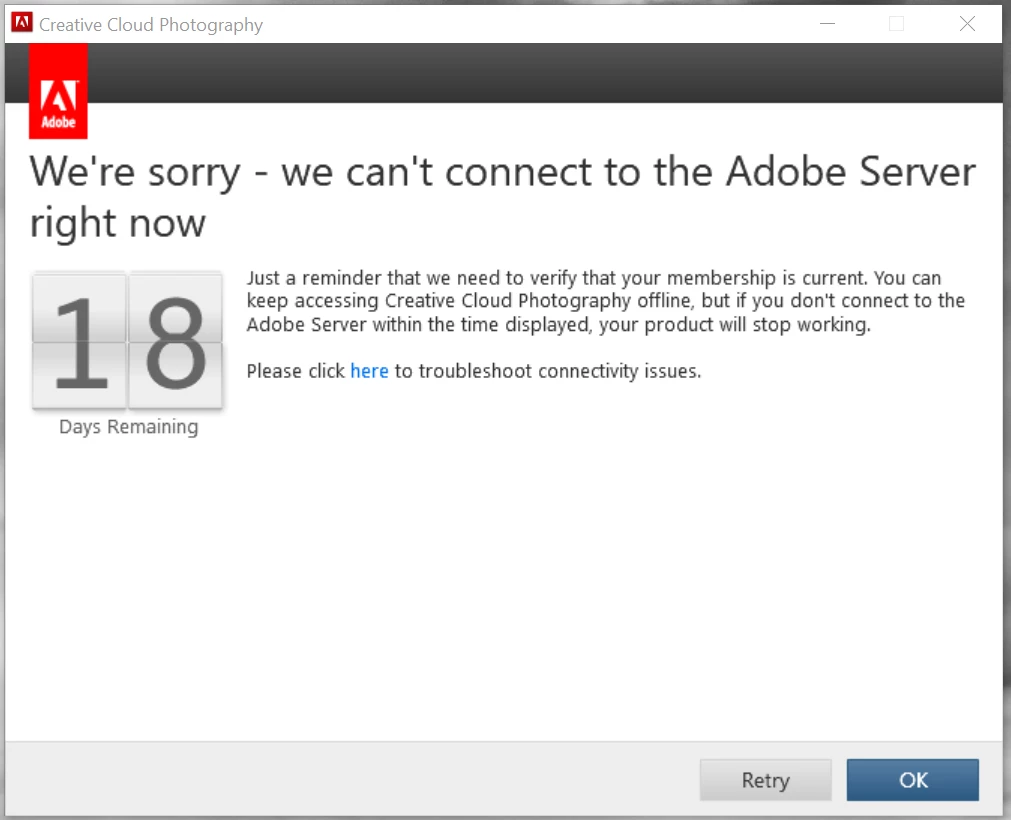 It's been several days that every time I open photoshop I get this message "we're sorry - we can not connect to the Adobe Server right now"
