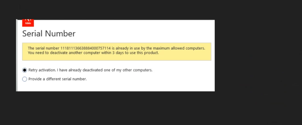 I have bought Acrobat Professional XI in 2014. I am trying to reinstall this on another machine but it is coming up with the following error. Serial Number The serial number xxxxxxxxxxxxxx is already in use by the maximum allowed computers. You need to deactivate another computer within 3 days to use this product. ◉ Retry activation. I have already deactivated one of my other computers. ○ Provide a different serial number.