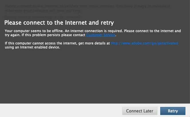 I opened Photoshop and am being asked connect to the internet for 'Serial Number Validation'. I AM connected to the internet but it keeps giving me the message: 'Please connect to the internet and retry. BUT I AM CONNECTED TO THE INTERNET!!