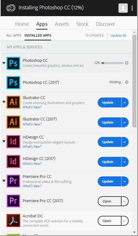 On opening Adobe CC system tray app in Windows 7 today I am seeing apps "doubled" up - those with "2017" suffixes and those without, both of which have "Update" as the primary action. Confused so far? Read on..