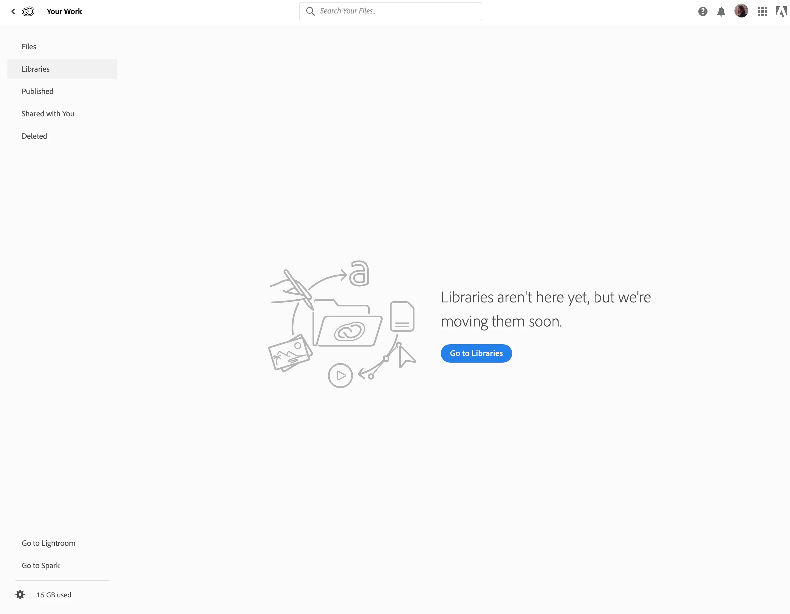 On my Adobe Cloud account, I see there has been update to the overall interface which is great news as it looks great, but when I enter into the "Libraries" area of the account a message appears "Libraries aren't here yet, but we're moving them soon." I have attempted to request support from Adobe on this matter, but they are failing to understand my question which is very simple - are we to expect to see an update in this area of the Cloud account anytime soon to mirror the rest of the account?