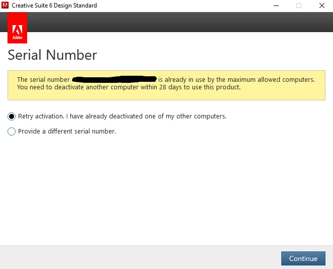 Hello, I'm trying to activate an old CS6 design standard suite, but I get the notification that my serial needs to be deactivated before it can be used. The old machine has been decommissioned for years so there is no way to do a manual deactivation to trigger a response. If I select it already has been decommissioned it just loops back to the same menu.