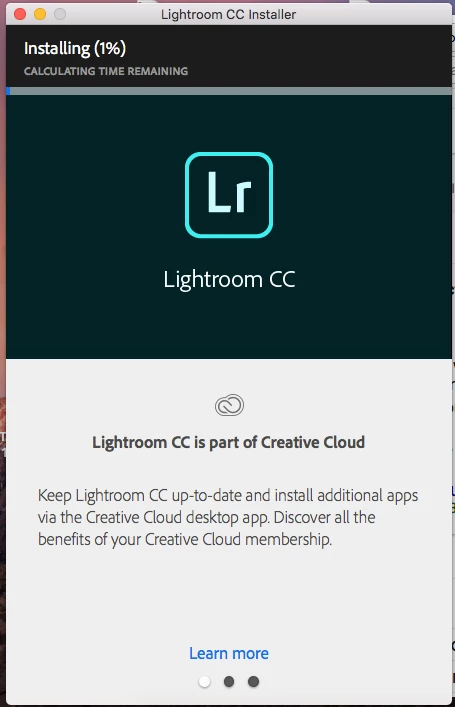 As you have mentioned you are trying to install Lightroom CC on your Mac OS 10.13 however the installer is stuck at 1% since past 30 mins.