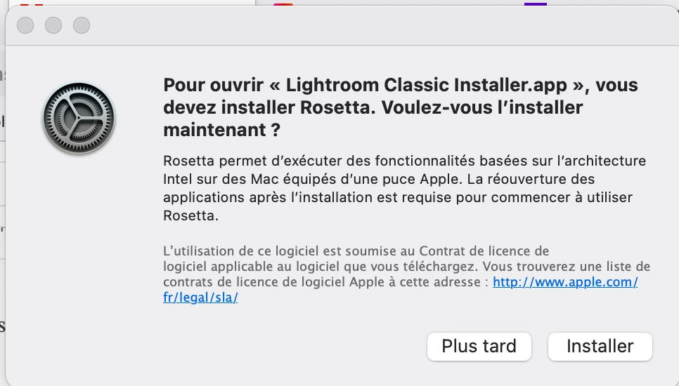 You are not running Lightroom, the screen shot shows this. You are running the special app "Lightroom Installer". It is very likely this will need Rosetta. You WILL need Rosetta, don't fight it !!