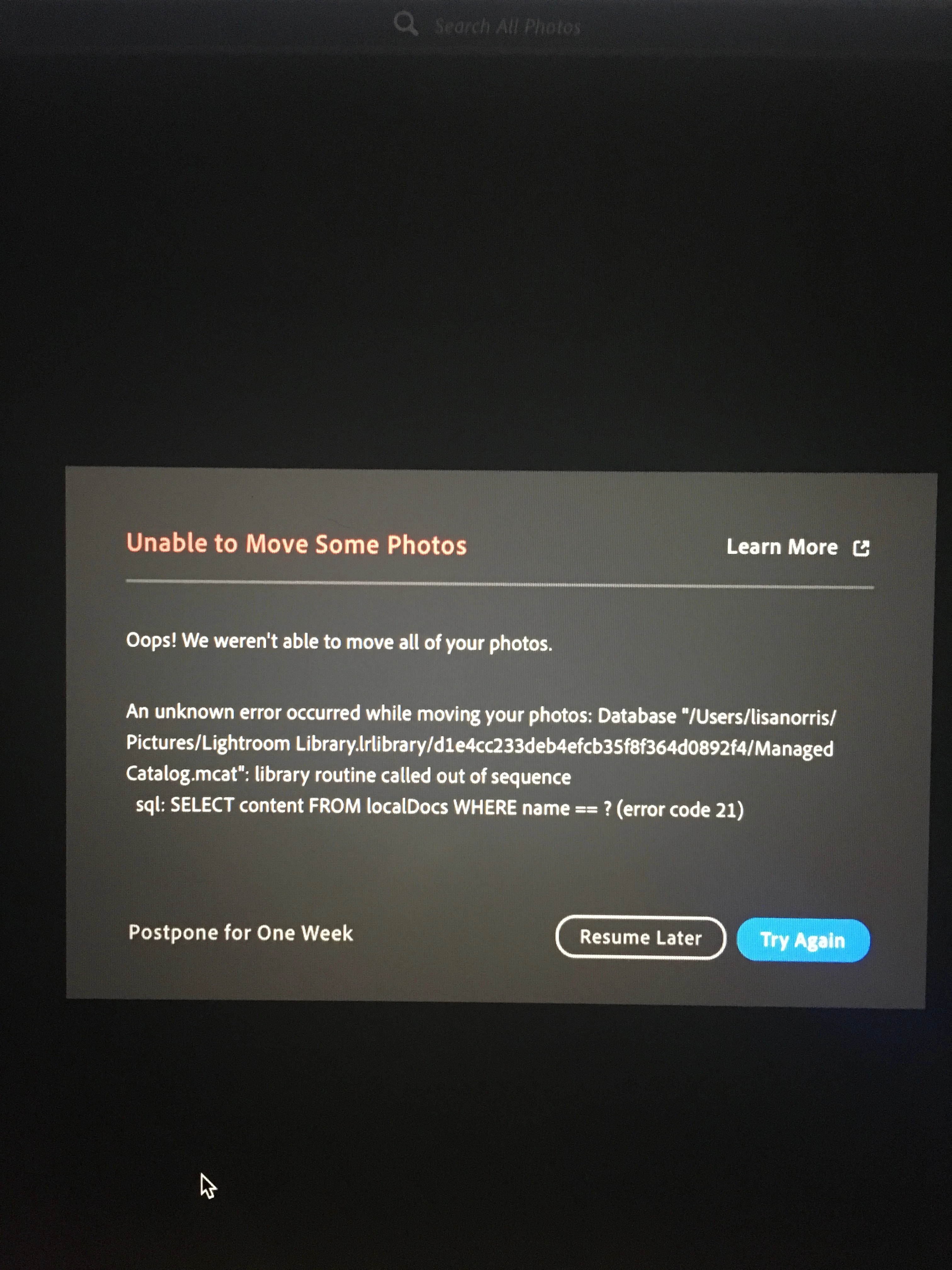 Lightroom Library Error code 21 [was: HELP!]