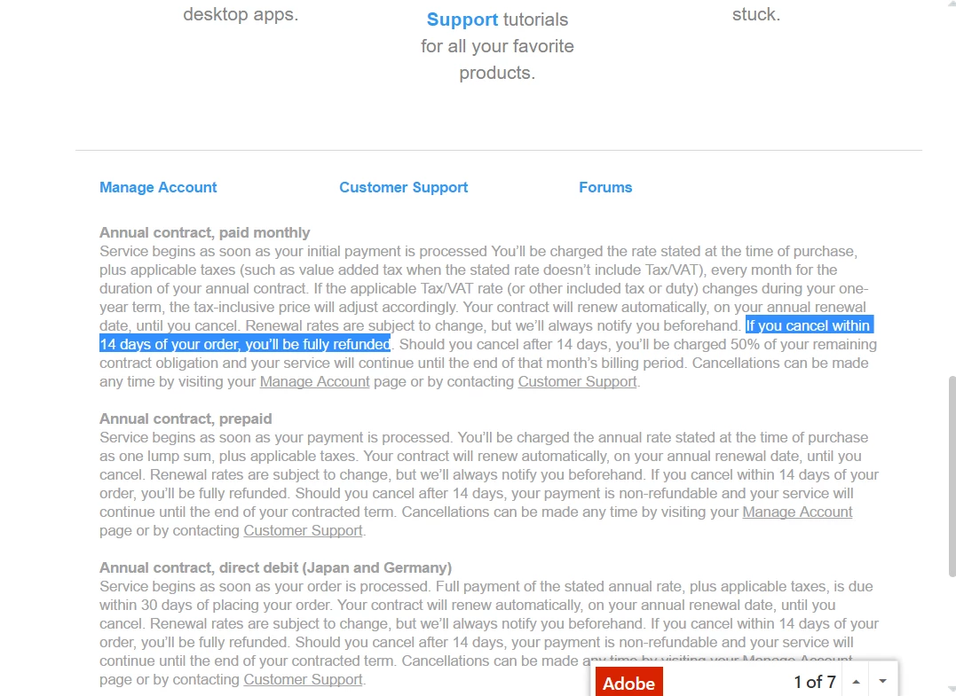 I immediately called Customer Service who of course gave me the song and dance about why I should stay with Adobe. I told them no, I am cancelling and refuse to pay the cancellation charge. At first I was told there was nothing they could do. I then told them I am in charge of a Adobe subscriptions for a large company and would start looking elsewhere if they did not cancel my policy without charging me.