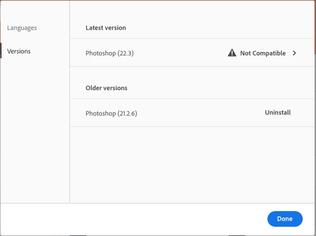 I have an iMac running OSX 10.13.6. Despite being 10 yrs old the computer itself is working fine with the exception of Photoshop. A recent update has rendered the software useless as it crashes all the time. I have version 21 on my desktop and 22 on my laptop which works fine, however, laptop is not really the place I do my main work. I wanted to revert to an earlier version of Photoshop that doesn't crash but that doesn't seem to be possible. The only options in the install earlier versions section show the latest incompatible version plus the version I have installed (which crashes). I see all the earlier versions for lightroom and thought it should be the same for Photoshop/Bridge. I just want to roll back one updated. Unfortunately I don't have a TimeMachine back up from an earlier version as I had inadvertently switched Time Machine off.