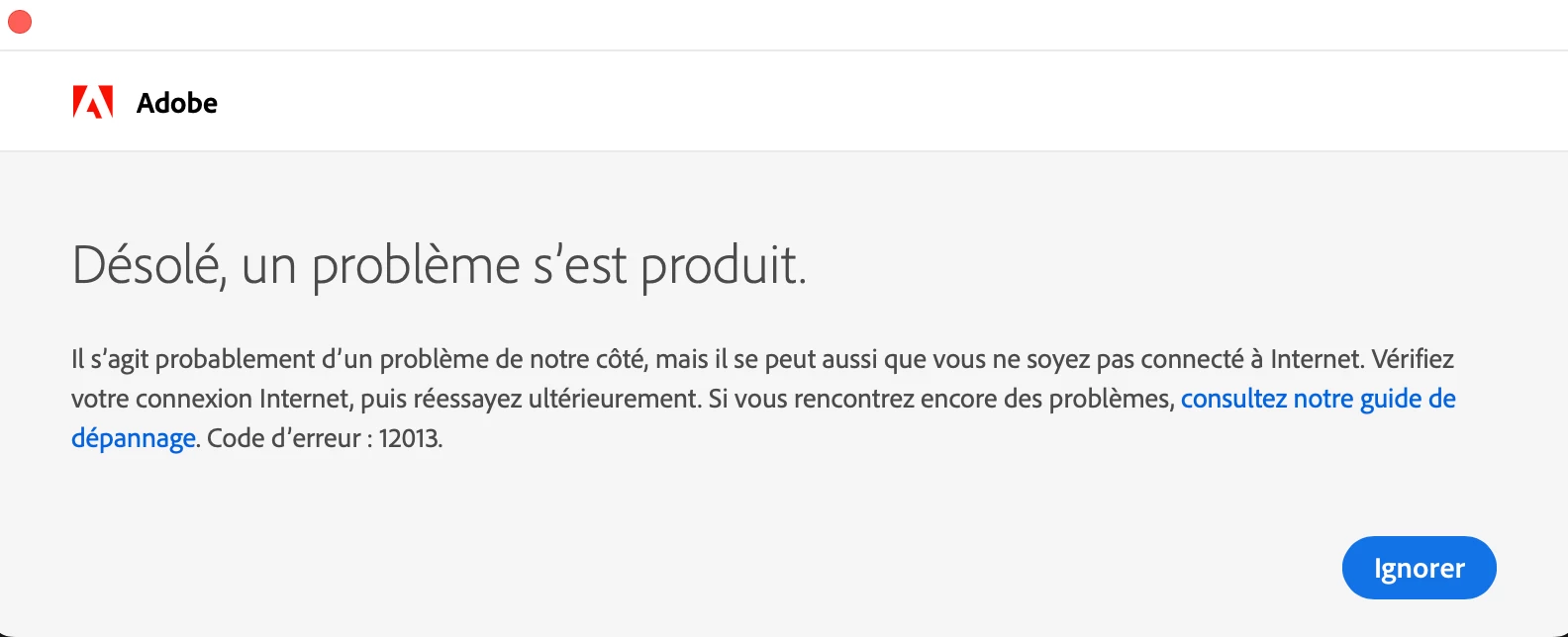J'ai essayé de mettre mon mac a la dernière mis à jour (j'ai un macbook pro M1 max 32go). Desinstallé puis reinstallé créative cloud mais malheureusement j'ai toujours ce message d'erreur. Je précise que ma wifi fonctionne très bien et que l'horloge de mon mac est reglée correctement