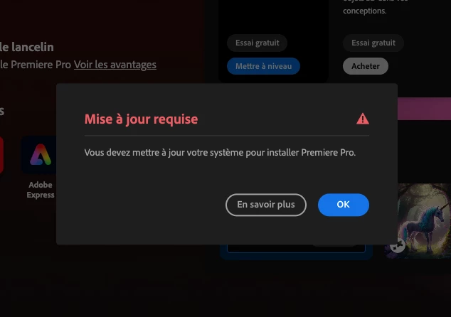Je veux télécharger Adobe premiere Pro mais on me demande de "mettre à jour mon système" (voir photo)