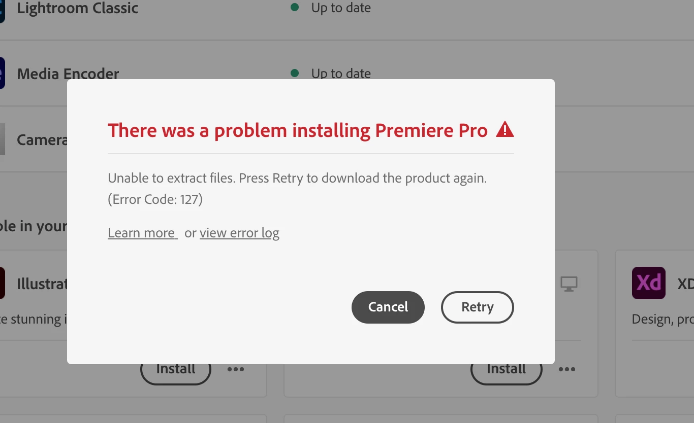Most of my adobe apps now crash as soon as I open them (lightroom being the only exception). I've tried reinstalling but then I get a 127 error. I have plenty of space on my macbook and no specific antivirus software installed which is one of the suggested areas to look at. My Mac software is also fully up to date.