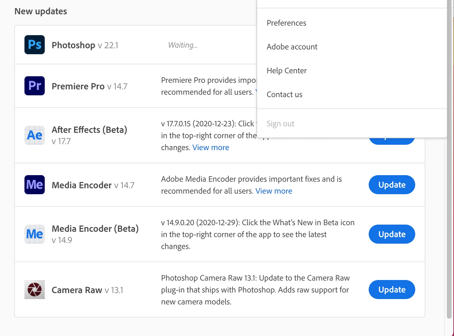 I have a list of apps that say they can be updated. So I click the blue update button next to Photoshop for instance and it just says "waiting..." I called Adobe about this same problem back in October. They had me go into application manager or something and force quit out of stuff on my apple computer but it was only a temporary fix because its now December and the issue persists. They acted like I was the only one with this issue, but my dad has his own separate Adobe account in a totally separate household and he has the same issues as me. he sign out button is still grayed out right now.