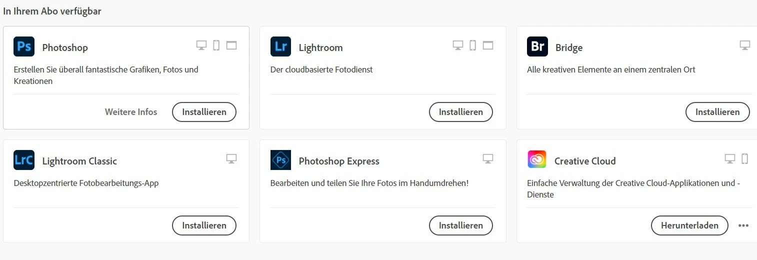 On top of that I noticed that when I go to https://creativecloud.adobe.com/apps/all/desktop it shows me that everyhing I installed before, says that it needs to be installed? (which wasn't before) Which isn't true because I've used photoshop so I did install it including the creative cloud and other programs. When I wanted to install it again, it went through the instalation screen and then loaded forever, so dead end again.