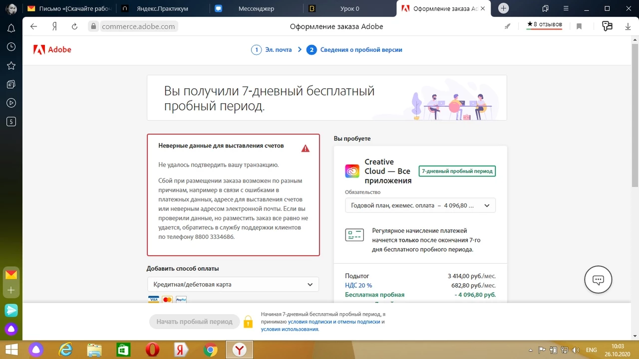 Здравствуйте, хочу попробовать скачать 7дневную бесплатную версию Creative Cloud, пробовала разные карты - свою Тинькофф, мужа Сбербанк (мастеркард), одна и та же ошибка - неверные данные для выставления счетов. Все данные перепроверяла! Месяц, год, владелец - все указываю верно. Как решить данный вопрос и скачать приложения?