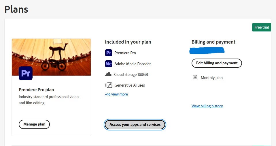 Hi all, I purchased the free trial for premiere pro, and I am able to see it under my plans. However when I go to my apps, I can only see the free trial and buy options in both the Creative Cloud app and in browser. I've tried logging in and out of both, and restarting the Creative Cloud app. As a result I can't find a way to actually install the premiere pro app, which is quite frustrating.