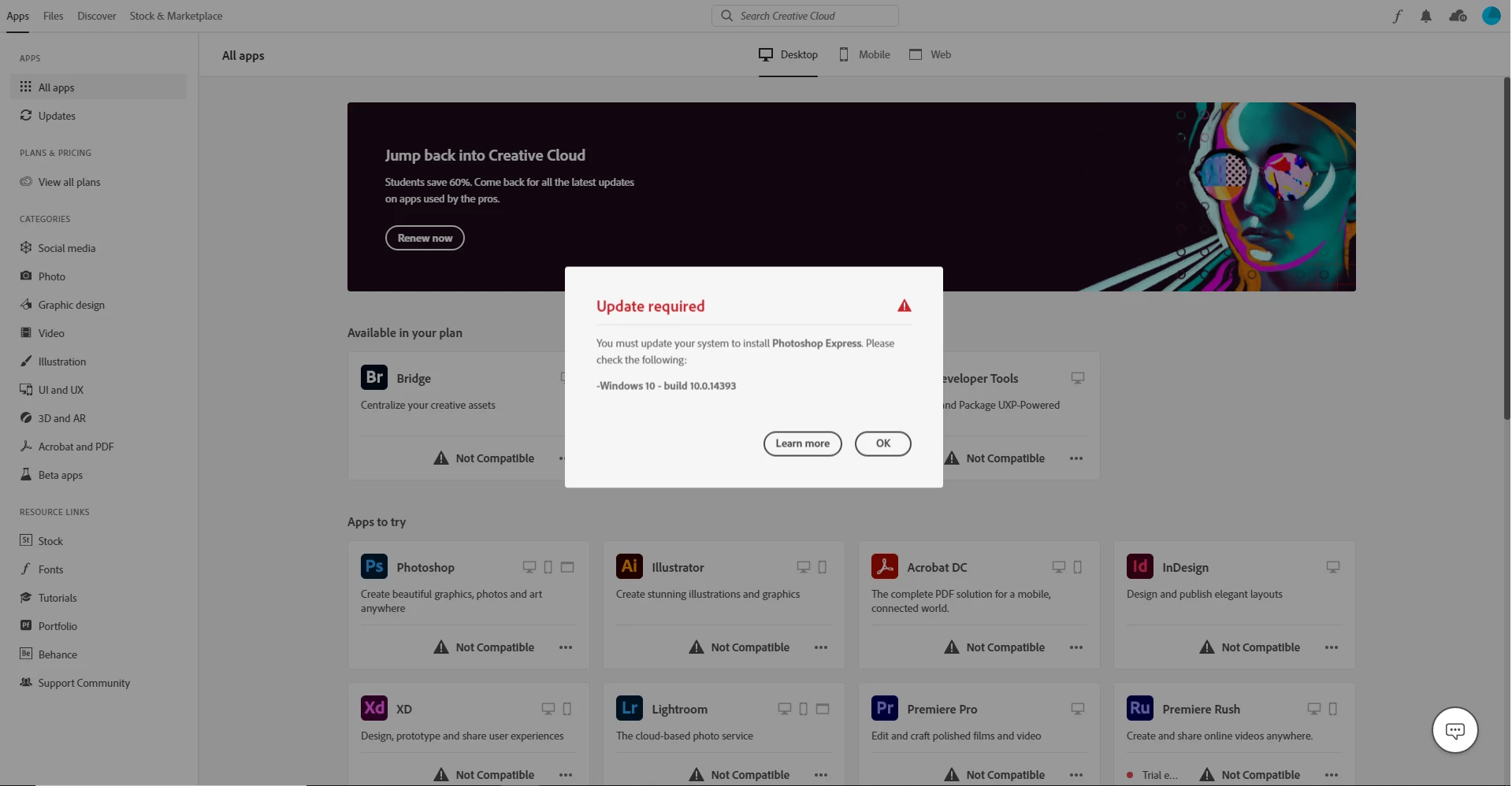 Hi, a few months ago I was using my computer and I watched that Photoshop had and update so I click there and the app send me the "NOT COMPATIBLE" message. Then every Adobe app started ask for update to be use. It says: "UPDATE REQUIRED. you must update your systemto install Photoshop Express. Please check the following: -Windows 10 - build 10.0.14393".