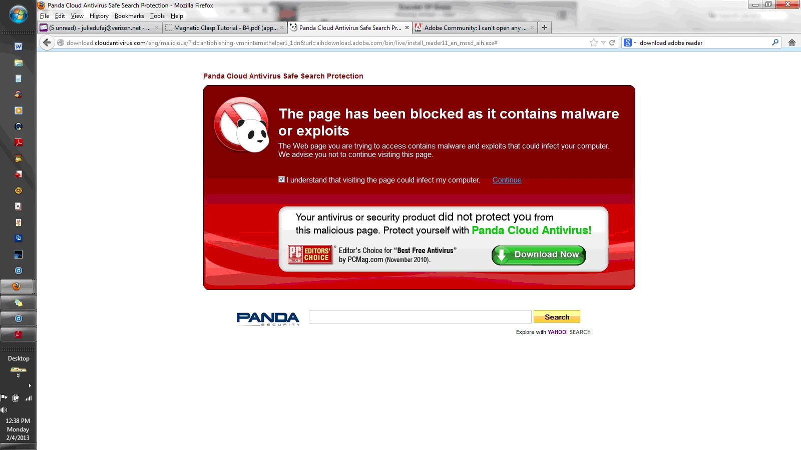 When I go to Adobe site and attempt to access download page, I get a warning from Panda Cloud Safe Search Antivirus Protection saying your page has been blocked because it contains malware or exploits. What's going on?.