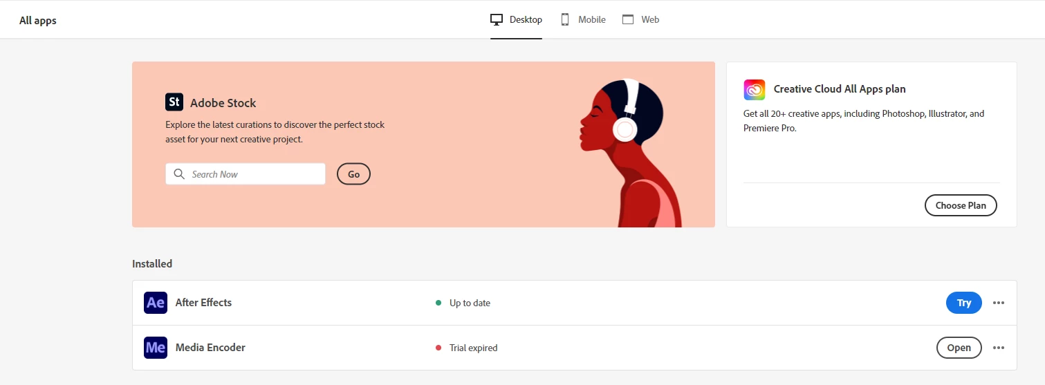 When I click my account overview, it has all the details of my plan there. However the only things under the "Available in your plan" section on All Apps | Adobe Creative Cloud are bridge, photoshop express, and the creative cloud desktop app. After effects and Media Encoder only display as the trial versions. If i try going through 'buy now' the pop up says 'you already own this program', so I'm stuck in a loop where I'm able to use what I'm paying for.