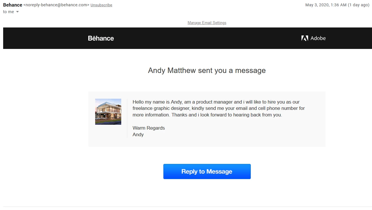 I have started looking for freelance work. I got this message that claimed it was from Behance, the link took me too an "OOPS..." page and I did not have the message in my Behance account either. Please help me figure out how to get real freelance work. Am I now in a security risk with my information because of this email??