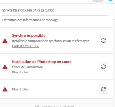 Vvéronique0101ParticipantForum|Forum|3 years agoMarch 12, 2022QuestionPhotoshop code erreur 306Forum|Forum|3 years agoMarch 12, 20221 reply682 viewsMy photoshop suddenly switched to English.I uninstalled it and tried to reinstall it, but it gives me an error code 306. So I re downloaded creative cloud, it says synchronization error and cannot download photoshop !!Installation