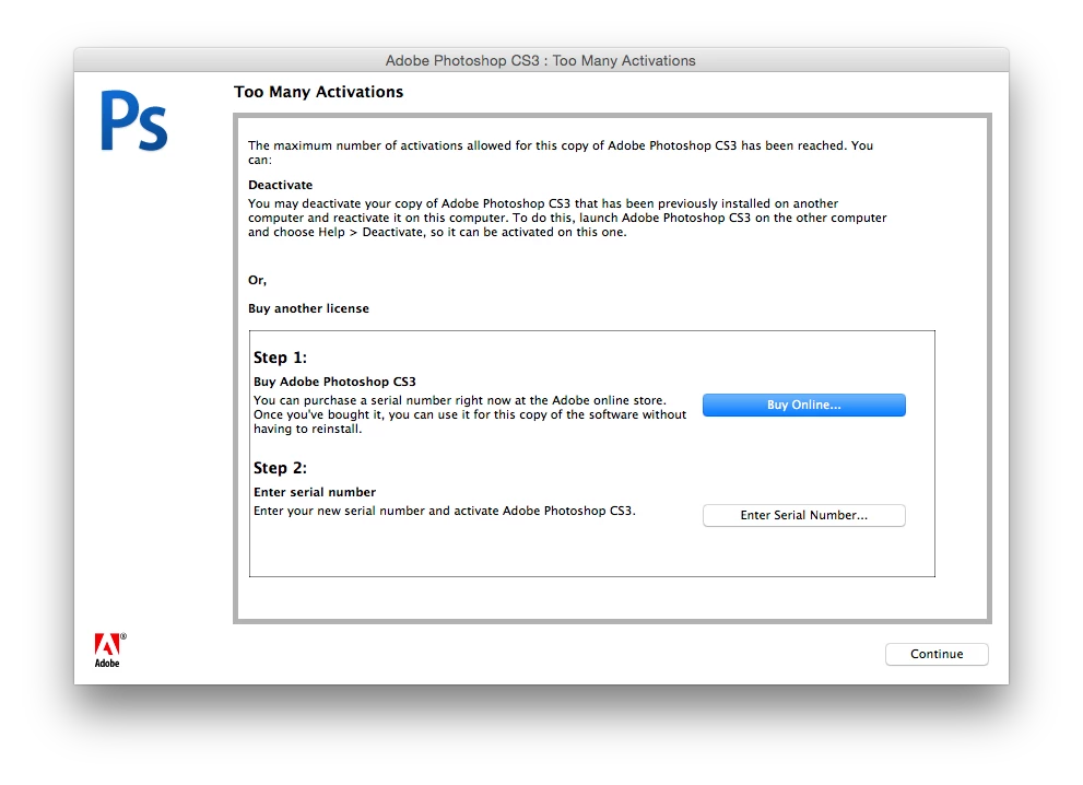 We are trying to activate Photoshop CS3 volume license we have but getting this message. How can we get it activated? This is a 43 user license we have, maybe 10 people here have it. We can't deactivate them because it's a volume license. We need Photoshop CS3 for Blu-ray authoring still, but have lots of people here on Creative Cloud 2014.