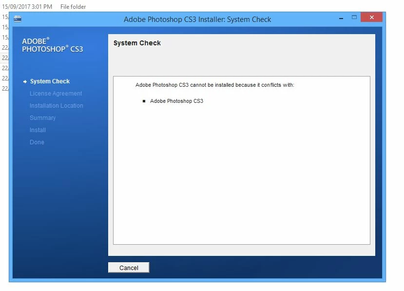 When trying to install the CS3 download the message shows