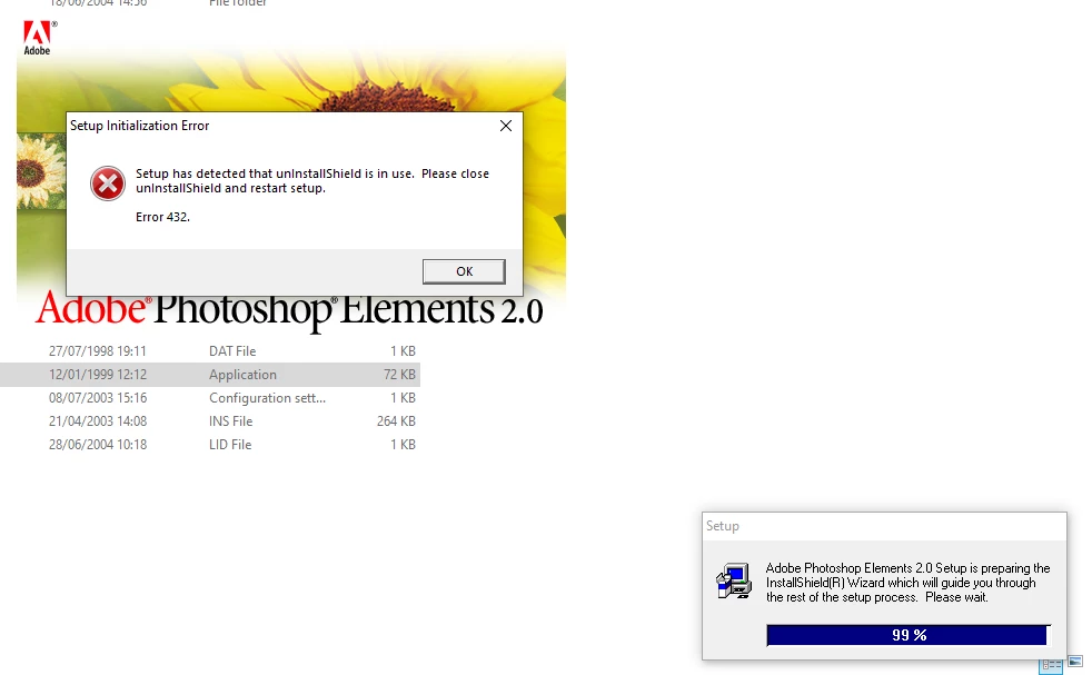 I previously had this software installed on my old Windows XP Pro machine but the PC hardware failed so I've had to buy a new PC with Windows 10 Pro. Most of the software I was previously using has reinstalled succesfully but Photoshop Elements repeatedly fails with this 432 error (uninstallshield in use, see attached screen shot). Photshop Album s/w on the same disc installs without any problems.