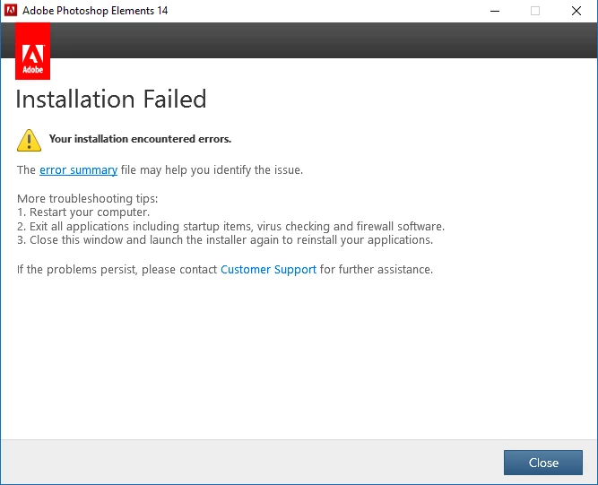 I have tried reinstalling as administrator, disabling my firewall, msconfig selective startup, and no antivirus. If is matters I am trying to install the 32-bit version on Windows 10 64 (The 64-bit version will not uncompress - Amazon download purchase). The laptop is a Dell XPS 9350.
