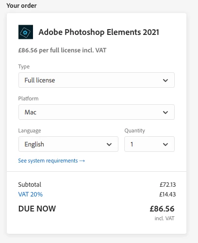 I now want to purchase the upgrade to Photoshop Elements 2021 at the discounted price that comes up on the web page. See attached images. When I proceed to purchase, I am given the UK price, which is not discounted. I happen to currently be in the UK, but I first set up my account from the US.