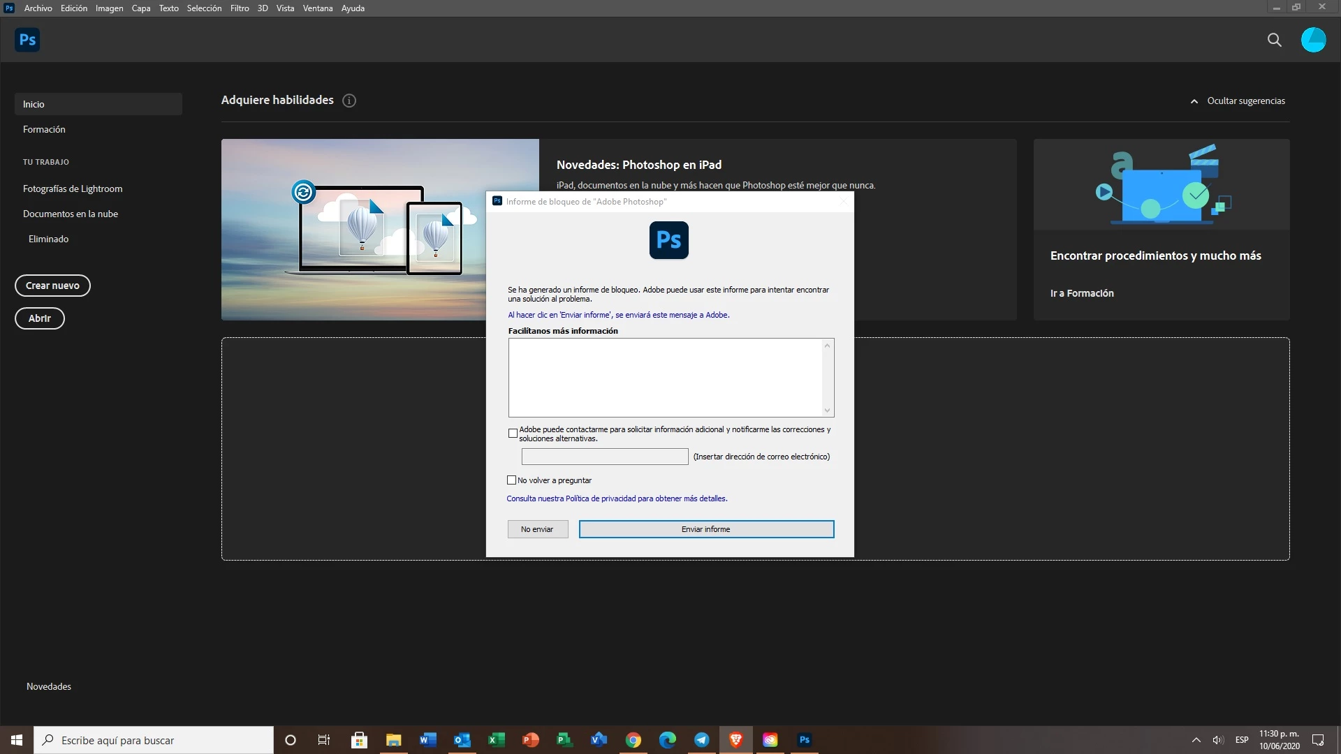 EecogamiUTPParticipantForum|Forum|5 years agoOctober 7, 2020QuestionPhotoshop esta bloqueado y no puedo abrirloForum|Forum|5 years agoOctober 7, 20201 reply218 viewsFavor ayudenme mi photoshop me manda un error de bloque y no se quiere abrir. Ya he enviado el informe de errores pero nada que me solucionan. Los demás programas de creative cloud si me abren. Adjunto captura del error.InstallationCreative Cloud