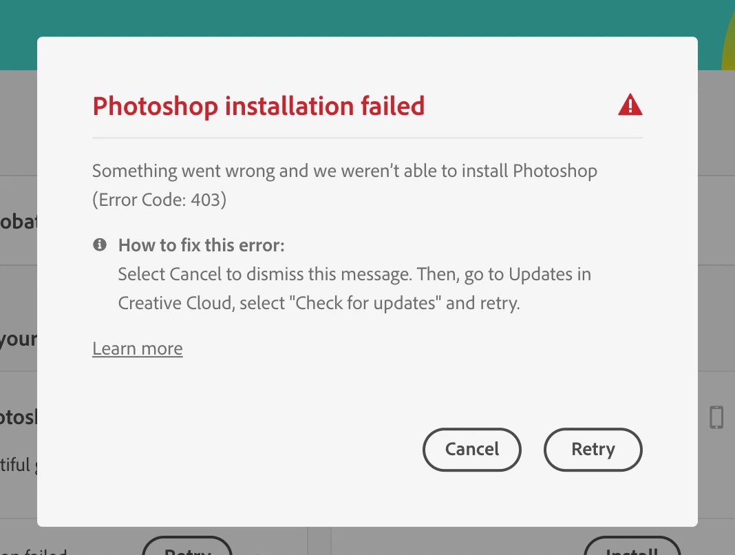 Stephane and WNT, Error 403 occurs due to a download error. What type of Creative Cloud membership are you utilizing? I don't see an active membership assigned to the e-mail addresses you have used to post to this public discussion forum.
